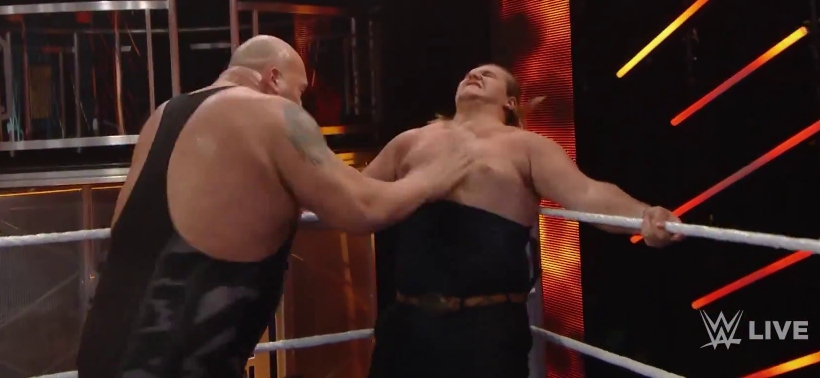 • Welllllll, what is Big Show here to do? A live “challenge” for the men to take a chop to the chest. Awesome, everyone has great craic. It’s like being at Ribera steakhouse! Was the perfect use of Show, and it’s his signature spot. He takes a shine to Mada hyping him up for the chop, who takes it like a boss. ZZ (who kept his undershirt on and Giant ripped it off – I hope it wasn’t his dad’s shirt)…he looked like he was shot by a cannon, crumpling afterwards. If I were Sara Lee I would’ve gotten up there to get a chop, it would’ve put her over huge and the other two women have implants so they literally couldn’t.